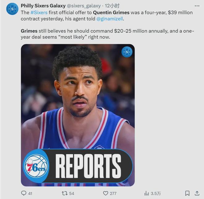 对玩家更新的另一次采访崩溃了! 76人队的公司记者吉娜·米泽尔(Gina Mizell)报道说,格莱姆斯(Grimes)在四年内要求年薪为2000万至2500万,8000万至1亿。但是,只有76人提供了为期四年的要约,以续签3,900万元人民币的合同,并且双方都有很大的不同。自由市场开放了两个多月,只有76人给了他这个报价。由于无法达成协议,Grimes在今天举行的团队媒体日幸存下来。此外,他不会去阿布扎比参加球队的季前赛。由于双方之间的摘录太不同了,因此Grimes可以选择一个临时人,例如每年1500万至2000万,然后寻求将76人队留在Supnod时段。当前的Grimes情况不如演出。勇士和拆除只是选择的差异(团队选择或球员选择)。从76人到grimes的报价非常侮辱。 grimes仍然是受约束的自由球员。在这个休赛期,76人向他提供了一年的一年资格提议,为870万美元。为什么76人没有给格莱姆斯一份大合同?两个因素:1。Embiid,George和Maxi在76ers中有三个最高工资。如果格莱姆斯(Grimes)有一份公路的合同,则团队的薪水空间将爆炸; 2。76人记得上个赛季的Grimes数据在锅中是一个闪光。下次他还会举行亮点吗?在2024 - 25年期间,Grimes为Mavericks打了47场比赛,其中包括12场首发比赛。他平均每场比赛22.8分钟,得分10.2分,3.8个篮板,2.1助攻,0.7次抢断和1.3个失误,他的三分命中率为:46.3%,39.8%和76.5%。今年2月,小牛被授予格莱姆斯(Grimes)和第二轮76人队,以换取卡莱布·马丁(Caleb Martin)。在Embiid,George和Maxie受伤,Grimes在76人队中拥有无限的消防权。他为76人打了28场常规赛,有2场5场开始游戏。他平均每场比赛33.7分钟,得分21.9分,5.2个篮板,4.5次助攻,1.5次抢断和2.9个失误,投篮命中率为3%:46.9%,37.3%和75.2%。与小牛时期相比,76人的政权数据在76ER中翻了一番。如果我们只看他在76ers的表现,据了解,格莱姆斯要求年薪2500万美元。但是问题在于,当Embiid,George和Maxi在下个赛季回来时,Gramime没有太多球时,他的数据肯定会撤退。 Grimes于2000年5月8日出生,高1.93米,宽2.03米。在2021年的NBA选秀大会上,Grimes在第一次旋转中以255顺位选中了Grimes,而快船队立即将他送到了尼克斯队,以换取基恩·约翰逊(Keon Johnson)。在尼克斯的两年半内,格莱姆斯平均每场得到8.6分,2.5个篮板和1.5次助攻。 2024年2月,尼克斯派遣了格里姆斯,弗林,弗林和两秒钟的活塞,以换取伯克斯和博安。在2024年早晨,活塞将Grimes送往Mavericks,获得了JR JR和3秒的选秀权。到目前为止,格莱姆斯(Grimes)在NBA职业生涯中平均分别为10.4个射手,3.1个篮板和2次助攻,三分命中率为37.5%。最后一个问题:您认为Grimes的价值是多少?
