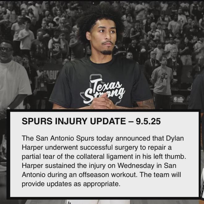 马刺正式宣布:新部门的第二位领导人迪伦·哈珀(Dylan Harper)在实践中略微撕裂了右拇指的略微撕裂。该小组表示,哈珀的行动成功进行了运营,预计将在10月23日赶上常规开放期。但是,领导者搜查并发现该行动的平均恢复期为54.3天。如果进行了此计算,哈珀很难赶上比赛的开幕。哈珀不是最糟糕的。托马斯·索伯(Thomas Sauber)的第15顺位在训练期间撕裂了他的右膝盖十字架,并将在下个赛季直接支付。 ESPN专家小组预测下个赛季最佳新秀,小牛队第一名得分为121分,马刺第二名得分38分,而76ers Titanball Edgecom则以25分排名第三。 2024年NBA最佳新秀是Wenban Yama,而2025 NBA最佳新秀是城堡。马刺球员已经连续两年赢得了这个奖项。在NBA历史上,没有任何团队能够o连续三年赢得最好的新秀。此外,由于福克斯的可用性,哈珀很可能是替代新时代的。在谈到他需要替代的需要时,哈珀说:“詹姆斯·哈登(James Harden)在雷霆队(Thunder)换了三到四年,等待他的机会。每个人都需要耐心等待,等待机会来。”值得一提的是,哈珀在高中时的昵称是“迷你硬化”。他还能想离开他的原始团队几年吗?这一天,马刺将他们的狐狸合同更改为2.29亿美元,提前四个陶恩。除了原始合同外,福克斯还剩5年零2.66亿美元,它将在2030年的标签中到期。如果他继续强迫哈珀,后者可能会离开马刺。记者萨姆·奎因(Sam Quinn)说:“福克斯,城堡和哈珀,我想至少有一个人会离开马刺两年。”哈珀(Harper)于2006年3月2日出生,高1.94米,宽2.10米。上个赛季,他平均19.4分,4个篮板,4个帮助,1.4个休息时间和2.4个大学失误,投篮命中率为3%:48.4%,33.3%,75%。在这个标签联赛中,他场均得到16分,4个篮板,2次助攻,1个休息和3.5个失误,投篮命中率为3%:35.7%,12.5%和78.6%。您认为哈珀适合马刺吗?他有希望赢得最好的新秀吗?